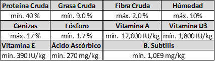 La harina de pescado tiene un aporte muy importante en este alimento; se encuentra como un punto negativo la cantidad de harina de pescado (debido a que se incluye como harina).