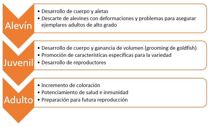 El crecimiento del Goldfish en su primera etapa se desarrolla en tres etapas, estas son las siguientes: Larva, Alevín y Juvenil; a continuación, se detalla cada uno de las etapas.